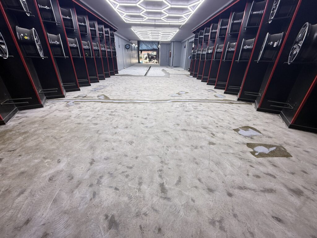 In Rotterdam hebben we bij Bandenwereld & Carwash in één dag een compleet nieuwe vloer aangebracht in de werk- en wasruimte. De bestaande ondervloer had flinke hoogteverschillen, die we zorgvuldig hebben geëgaliseerd voor een strak eindresultaat. In totaal is 90 m² aangepakt met een 4-laags PMMA systeem en een afwerking die voldoet aan de functionele én visuele wensen van de klant.
